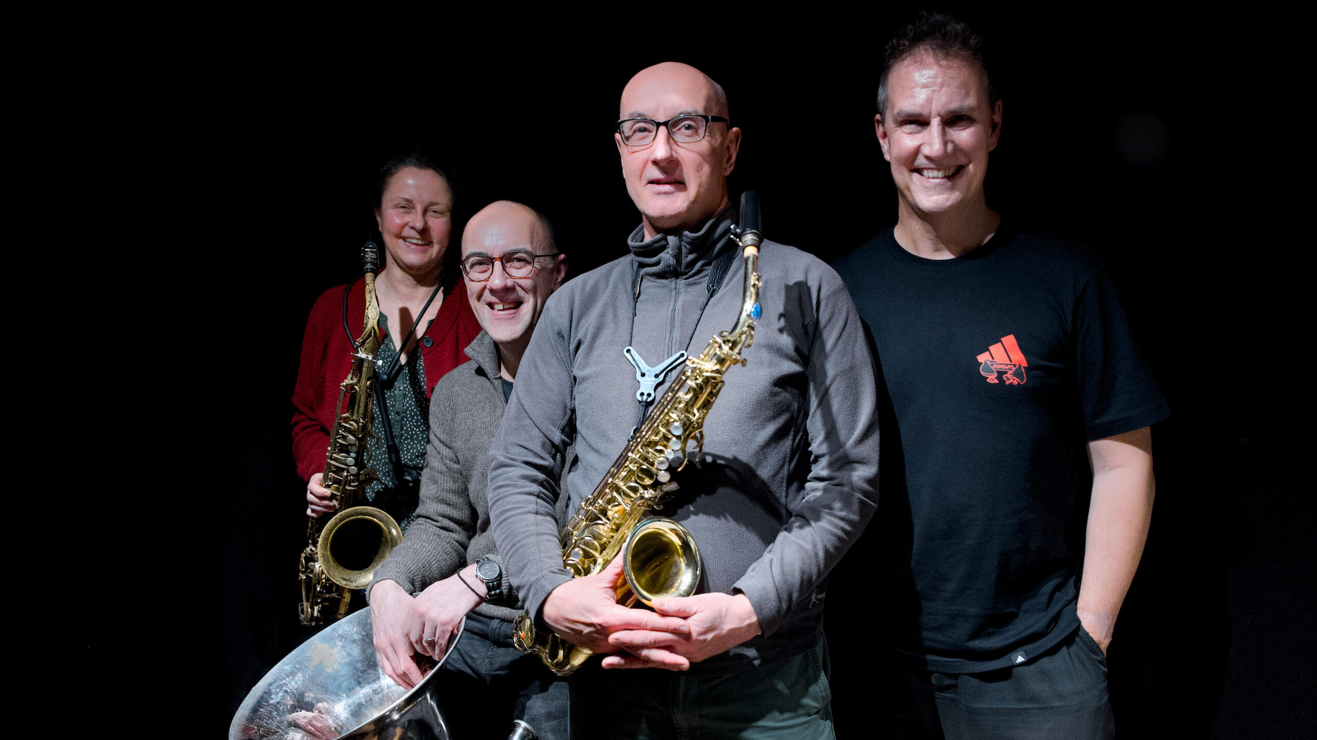 In particular Indian, Arabic, Turkish, African and Jazz traditions. The latest incarnation is Charukesi, named after an Indian raga. Previous versions were Fever Pitch, Unison Quartet and Mafarowi. It is direct, groove based music with compelling and memorable melodies rooted in a dynamic tuba and drums rhythm section with impassioned soloing and interaction from Alyson Cawley’s tenor and Martin’s alto saxophone.